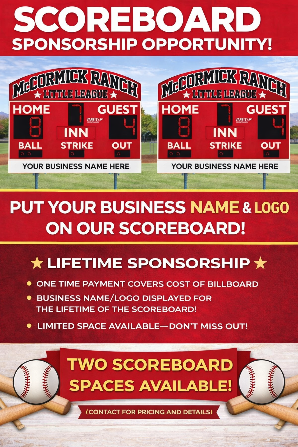 Your donation will not only go to buying additional equipment, but might help a family play ball who couldn't normally afford a glove or helmet. You also get custom banner/uniform exposure at our fields, online exposure, and shout-outs and mentions for your business among the Little League community. Check out the attached sponsorship opportunity and share it with anyone you know who might be interested.